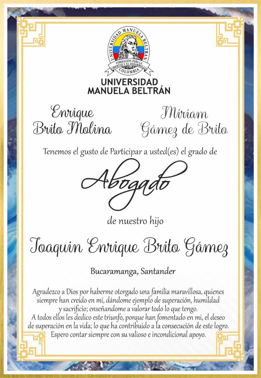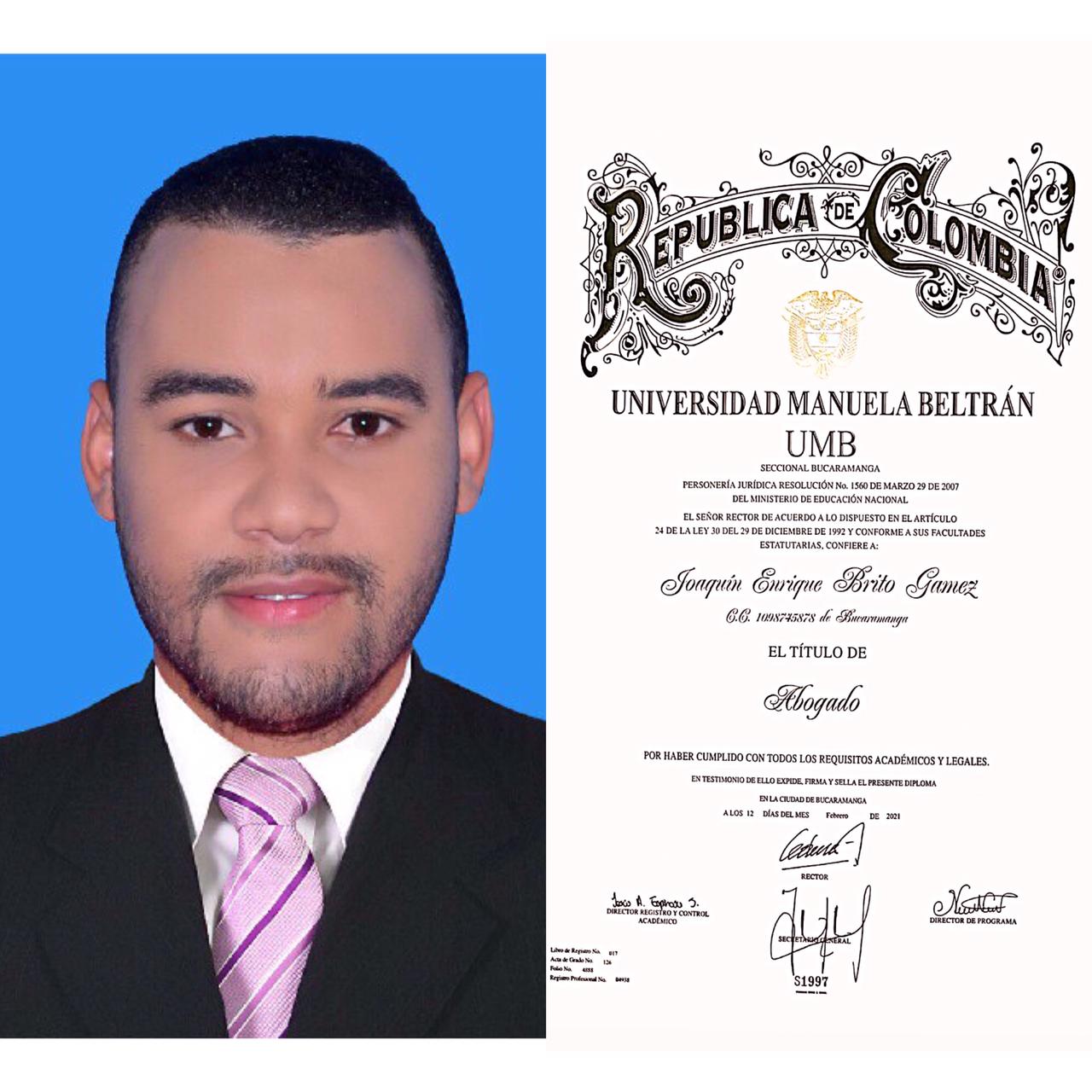 El ministerio de educación nacional mediante la universidad Manuela Beltran de la ciudad de bucaramanga,concedió el dia 12 de febrero, título de abogado al estudiante Joaquín Enrique Brito Gámez,por haber cumplido con todos los requisitos académicos y legales.