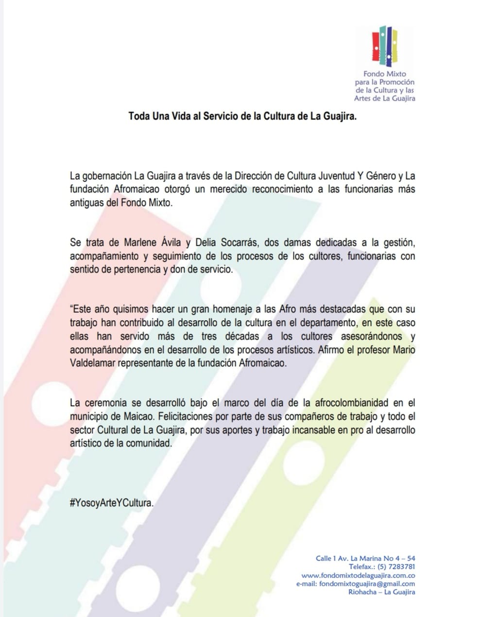 La dirección de cultura juventud y género la fundación asomaicao, hicieron reconocimiento a funcionarios del fondo mixto