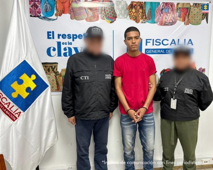 Un hombre joven con camiseta roja y pantalón de jean está esposado y custodiado por dos funcionarios del CTI vestidos con chaquetas negras y gorras. La escena ocurre frente a un fondo con el logo de la Fiscalía General de la Nación y varias mochilas coloridas colgadas como decoración. A un costado se observa una bandera blanca con el emblema de la Fiscalía.