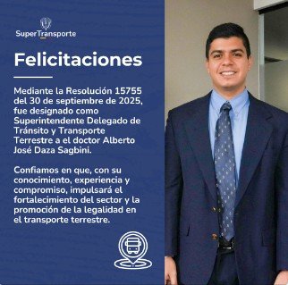 La Superintendencia de Transporte escogió al doctor Alberto José Daza Sagbini, designado como Superintendente Delegado de Tránsito y Transporte Terrestre mediante la Resolución 15755 del 30 de septiembre de 2025.