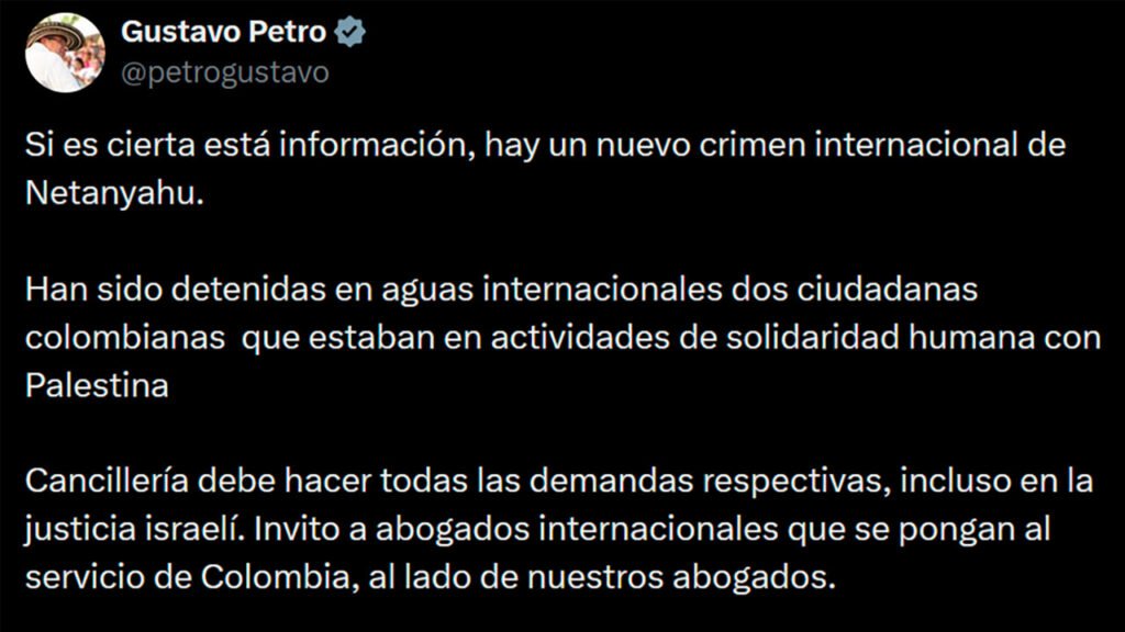 El presidente Gustavo Petro Urrego anunció este miércoles, a través de sus redes sociales una serie de medidas en respuesta a la detención, en aguas internacionales, de dos ciudadanas colombianas que realizaban actividades de solidaridad humanitaria para la población palestina en Gaza, a bordo de la Flotilla Global Sumud.