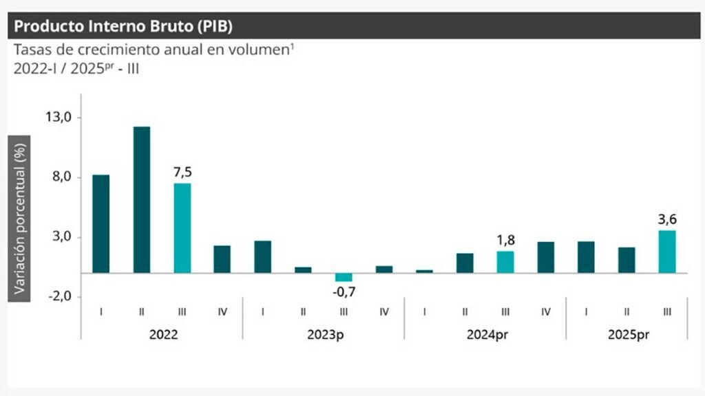 El Departamento Administrativo Nacional de Estadística (Dane) reveló que el crecimiento del Producto Interno Bruto (PIB) para el periodo julio a septiembre tuvo un crecimiento de 3,6 puntos porcentuales frente al mismo periodo del año pasado, mientras que el Índice de Seguimiento a la Economía (ISE) aumentó en 4 puntos porcentuales con relación al mismo mes de 2024.