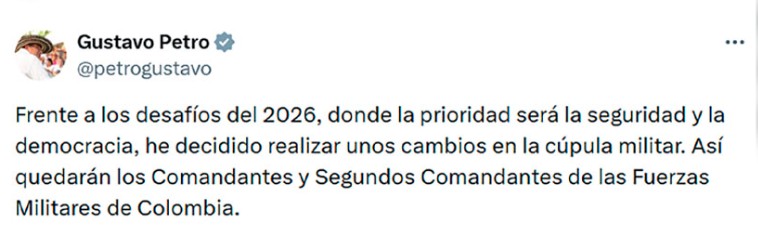 El presidente Gustavo Petro anunció cambios en la cúpula militar “frente a los desafíos del 2026, donde la prioridad será la seguridad y la democracia”.