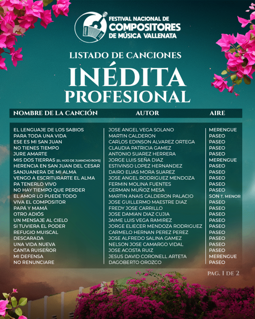 El Festival Nacional de Compositores de Música Vallenata confirma que las 45 canciones inscritas en la categoría Canción Inédita – Profesional harán su presentación en tarima durante la programación oficial de esta versión.