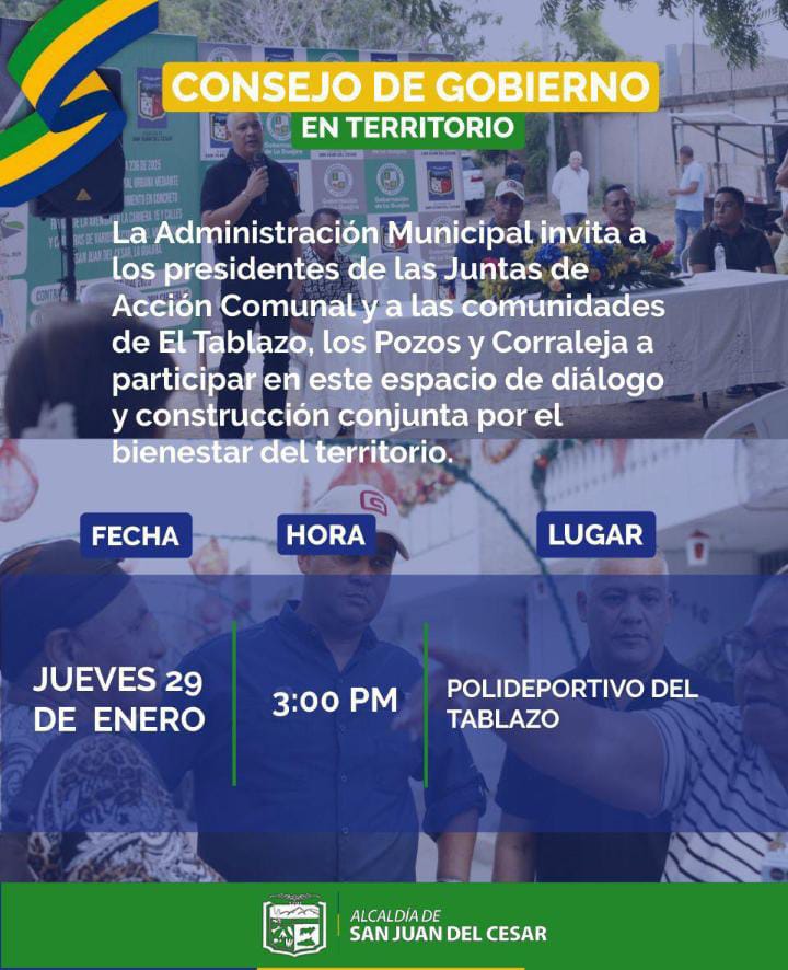 Con el objetivo de abrir un espacio de diálogo para la construcción conjunta de una estrategia encaminada a buscar el bienestar de las comunidades, la administración municipal de San Juan del Cesar, liderada por el alcalde Cubita Enrique Camilo Urbina Suárez, realizará un Consejo de Gobierno en territorio este jueves 29 de enero en el corregimiento de El Tablazo.