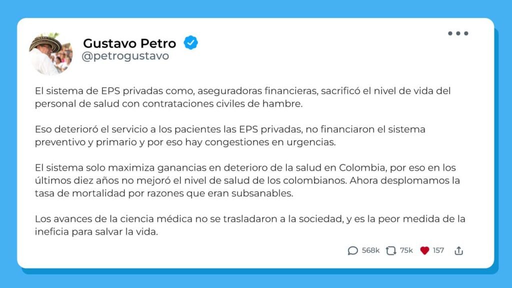 Así lo dijo el jefe de Estado en su cuenta de X, donde explicó cómo se les deterioró el servicio a los pacientes de las EPS privadas, pues no financiaron el sistema preventivo y primario, razón por la cual, según el presidente, “se generan enormes congestiones en los servicios de urgencias”. ´