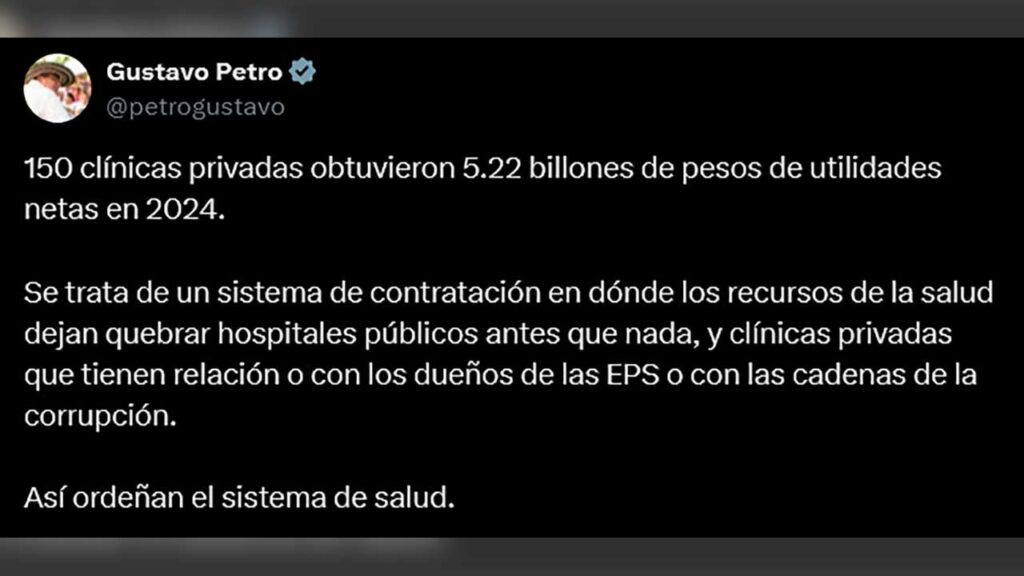 A través de su cuenta oficial en la red social X, el jefe de Estado afirmó: “150 clínicas privadas obtuvieron 5.22 billones de pesos de utilidades netas en 2024”. El mandatario hizo referencia a estas cifras en el contexto del desempeño financiero del sector privado de la salud.