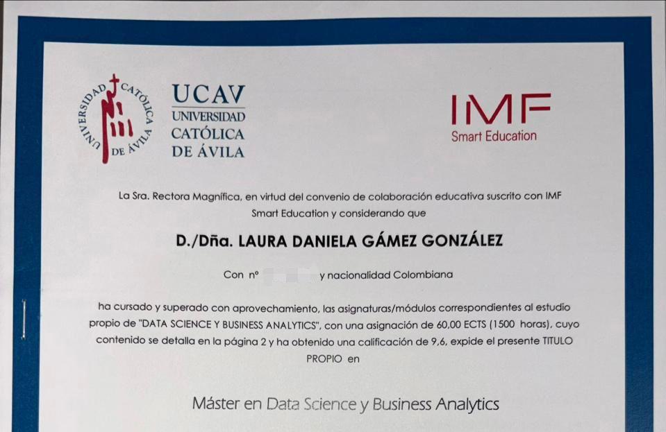 En un paso significativo para su carrera profesional, la colombiana Laura Daniela Gámez González ha recibido oficialmente su título de Magíster, otorgado por la prestigiosa Universidad Católica de Ávila (UCAV) en España.