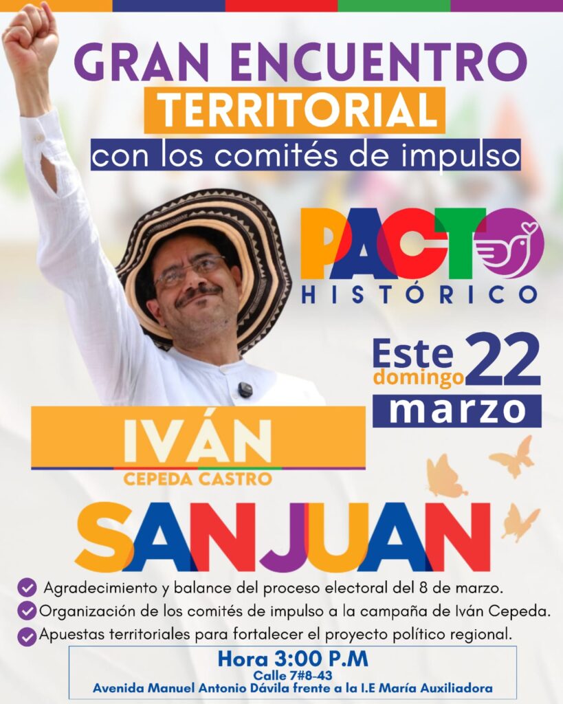La Dirección nacional del Pacto Histórico, Invita a todos los militantes y simpatizantes de la campaña del próximo presidente de colombia Iván Cepeda Castro a participar en el gran encuentro territorial con los comités de impulso, se trata de un espacio de agradecimiento y balance del proceso electoral del 8 de marzo, así como de organización para seguir fortaleciendo este proyecto político en el municipio de San Juan del Cesar donde tendremos la presencia de la senadora electa Johana Osorio, los miembros de la lista a cámara, entre esos, el líder social Limbano Diaz Hernandez y el diputado por el Pacto Histórico Luis Fernando Lobo Barrera.