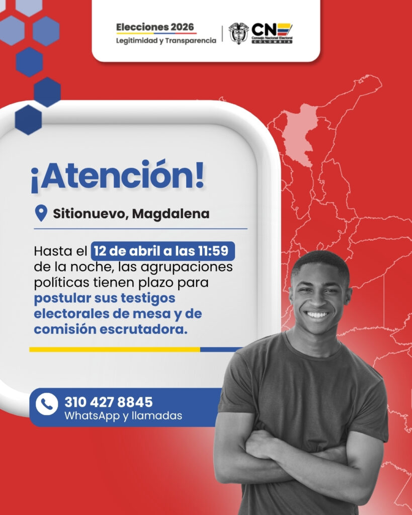 Llamado a la Acción: Instamos a los representantes de los partidos y movimientos políticos a realizar sus registros de manera oportuna para evitar congestiones en el sistema y asegurar su representación en cada una de las mesas de votación del municipio de Sitionuevo.